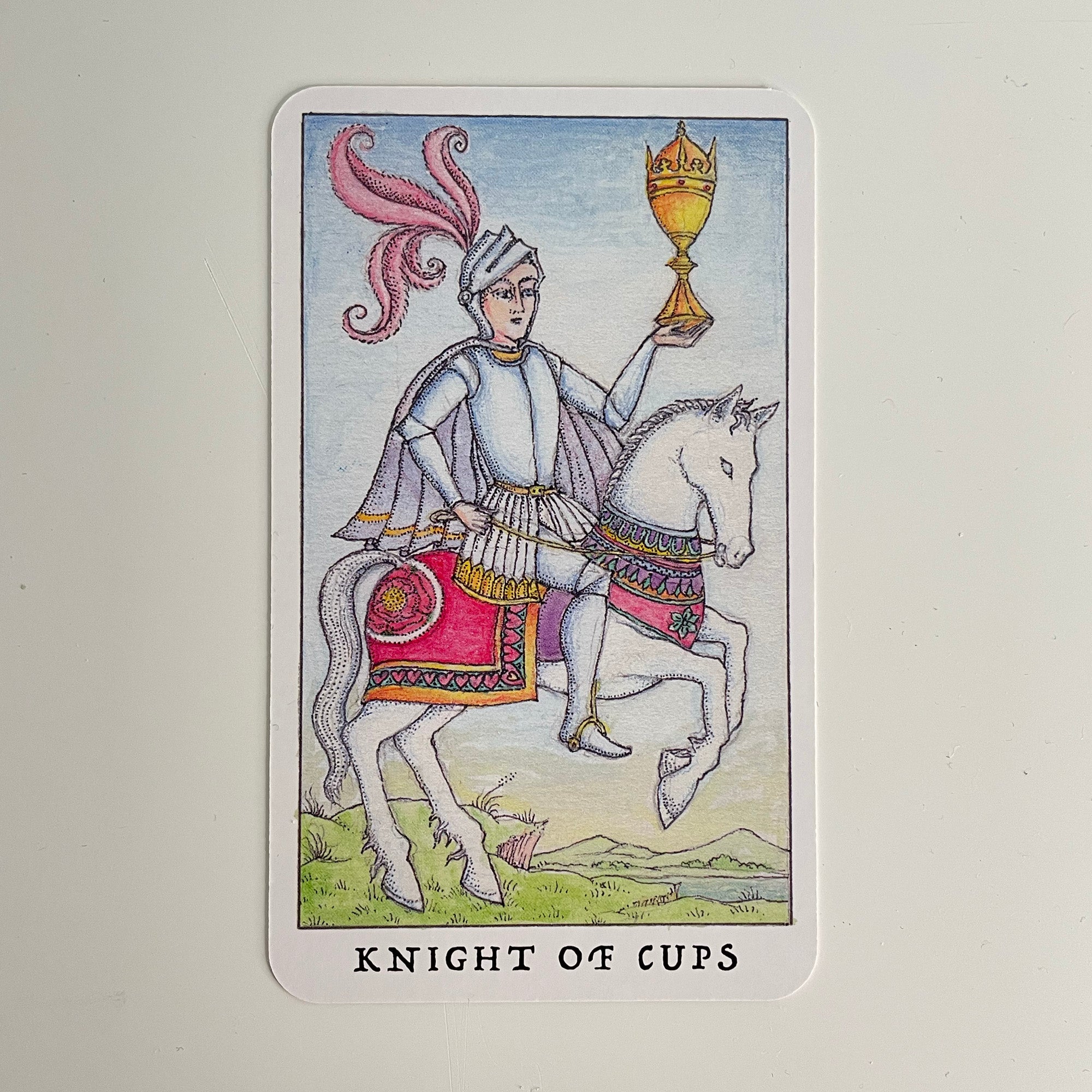 Our last Knight, from the more traditional Rose Tarot is seated upon a white horse. He looks elegant and in control and has more movement in his image than the other two Knights. He may be based on a Grail Knight, Galahad, the son of Lancelot and Elaine. A hero type, guided by his heart, maybe bringing a message, an invitation or proposition. He knows what he wants and has his emotions under control.