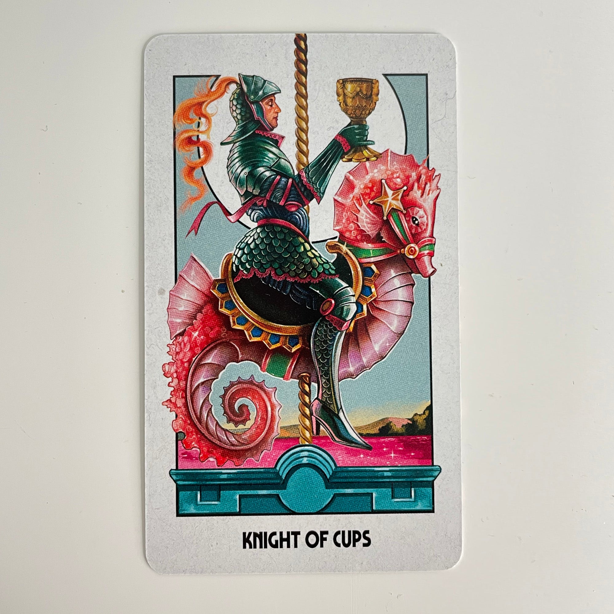 The Knight of Cups in the Supernova Tarot is one of my favourites, he’s just so fancy and full of charm. He’s not shy, he can express his emotions confidently and calmly. He gracefully rides his fun fair sea horse through an ocean of emotions, ready to bear his heart. He is on a quest, whether that is to find his soulmate or take a step forward towards manifesting his ideas and dreams. He’s not afraid to say, “I like you” or “I can do that job”. He raises his cup as he sits relaxed, he appears to have everything under his control and it all look incredibly romantic!
