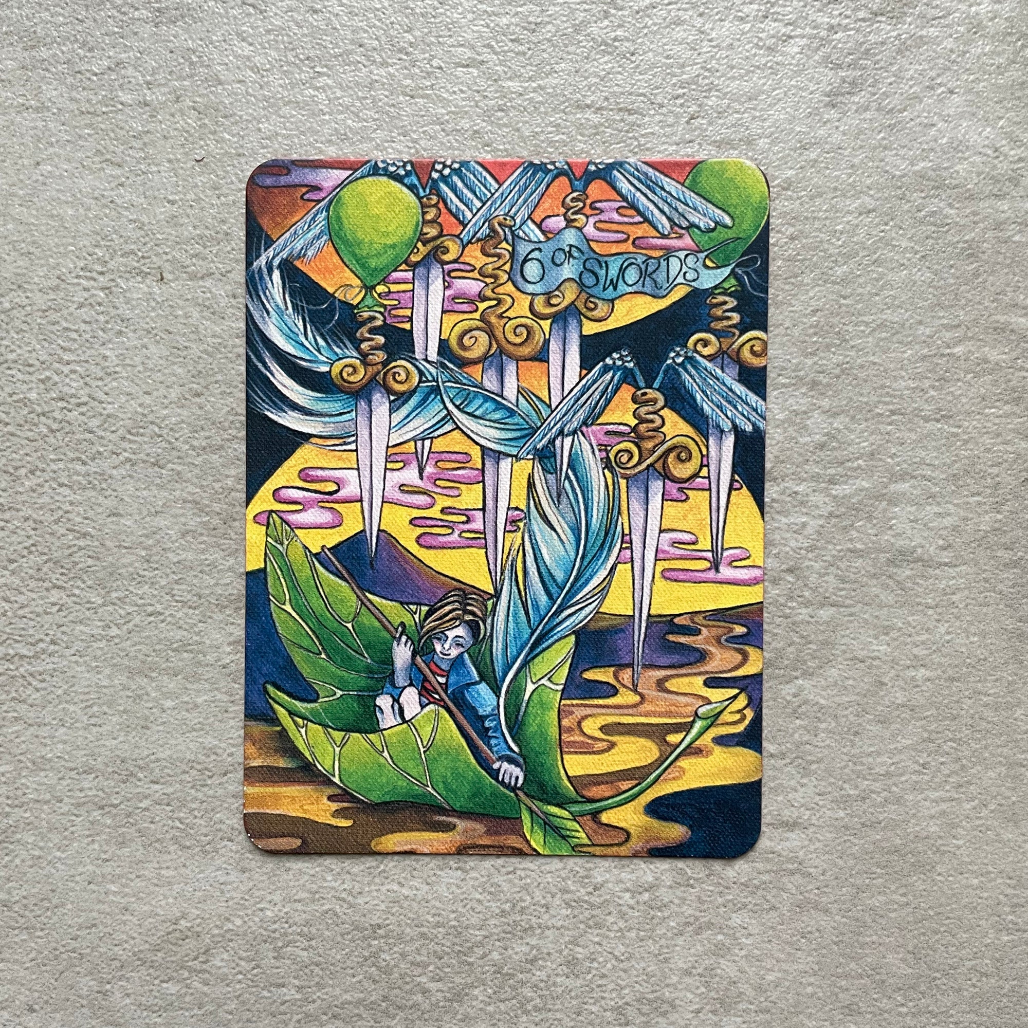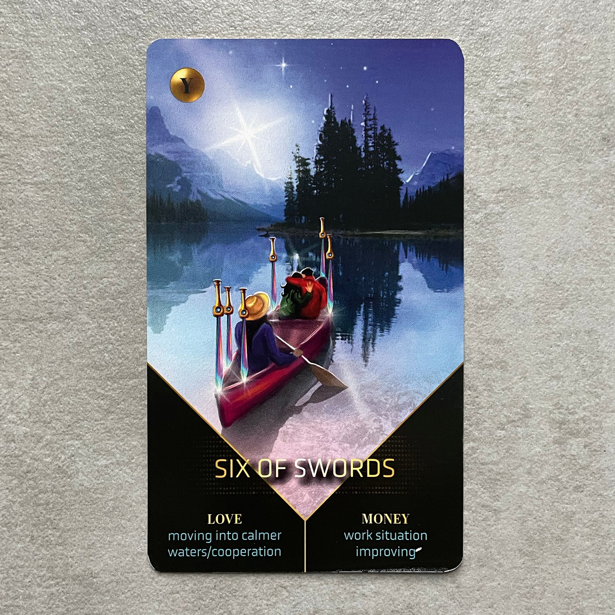 Il sei di spade ci invita a lasciar andare, ad andare avanti, a fuggire e a ricominciare. C'è conforto in questa carta, un guardiano che ti assiste con la certezza che tutto andrà bene. Calma i tuoi pensieri. Lascia andare il peso delle vecchie convinzioni. Sappi che hai acquisito saggezza dalle tue esperienze, ma non lasciarti trascinare. Mantieni la leggerezza, segui il flusso e vai avanti.