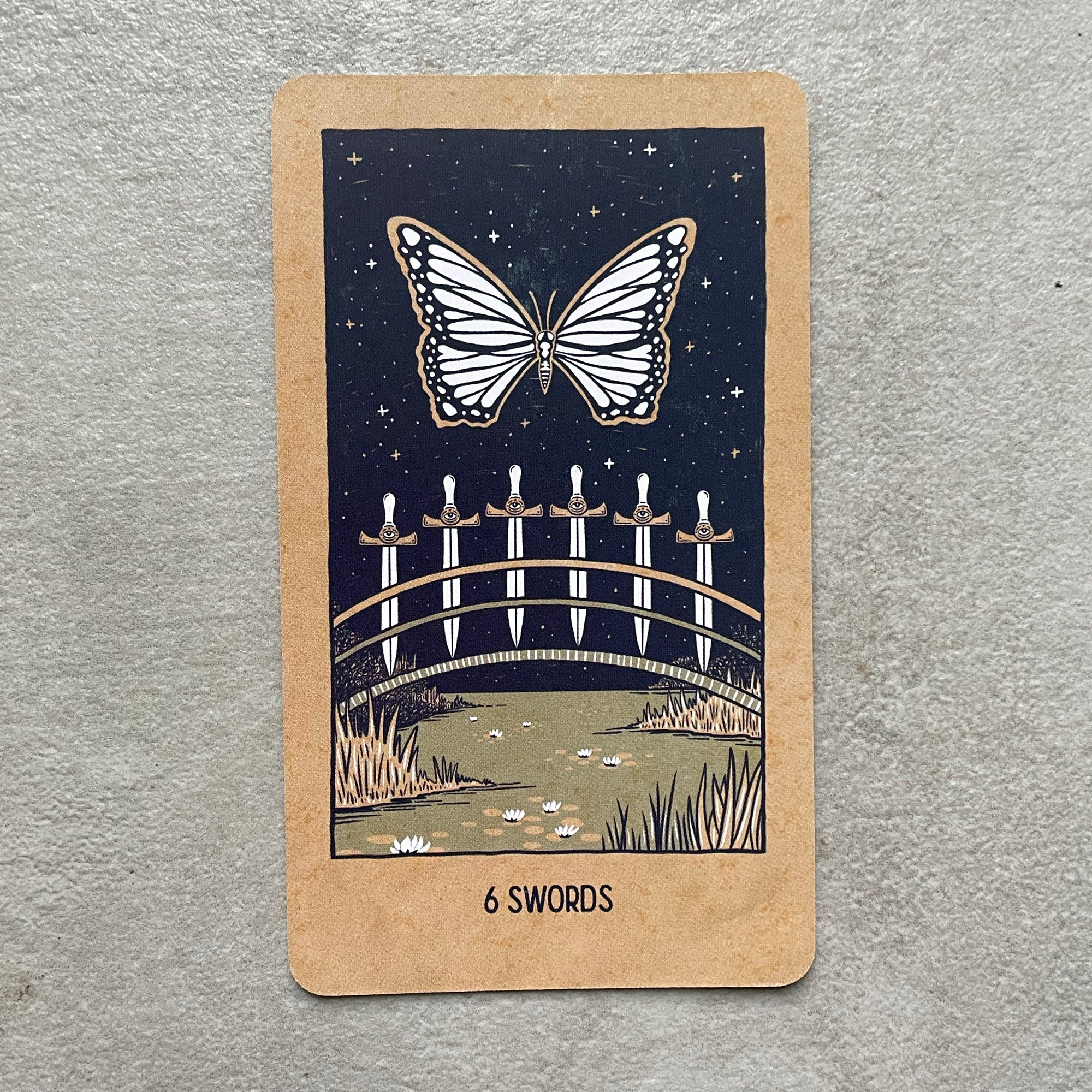 Nei Transient Light Tarot di Ari Wisner non ci sono figure raffigurate, ma una farfalla nel cielo sopra un ponte. Le sei spade sono in equilibrio sul ponte, l'acqua scorre placida sotto. Questa carta ti invita ad andare avanti, o addirittura a scappare, a evadere e ricominciare. Qualunque siano i tuoi fardelli, lasciali alle spalle, considera questa carta come un rito di passaggio verso un nuovo inizio. Un inizio di calma, chiarezza, libertà e leggerezza.